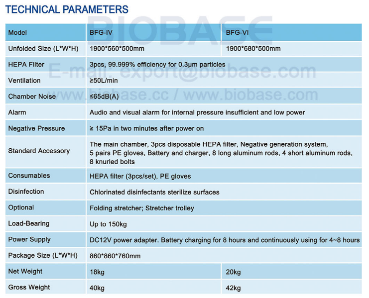 BIOBASE Biological Isolation Chamber는 자체 음압(negative pressure) 필터 시스템을 갖춘 이동형 격리 장비로, 오염된 환자 또는 물품을 안전하게 이송할 수 있도록 설계되었습니다.